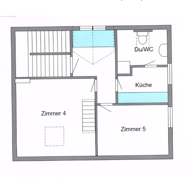 | Dachgeschoss | Einliegerwohnung: Diele, Küche, Duschbad, 2 Zimmer. |